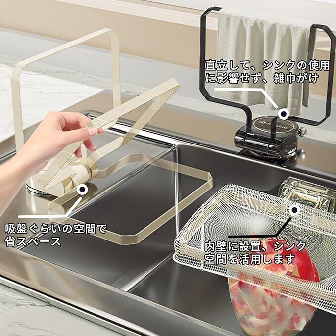 【スペース節約】:コンパクトでスリムなデザインにより、キッチンのスペースを有効に活用できます。シンクの縁や内壁に簡単に取り付けられるため、作業スペースを広く保つことができます。